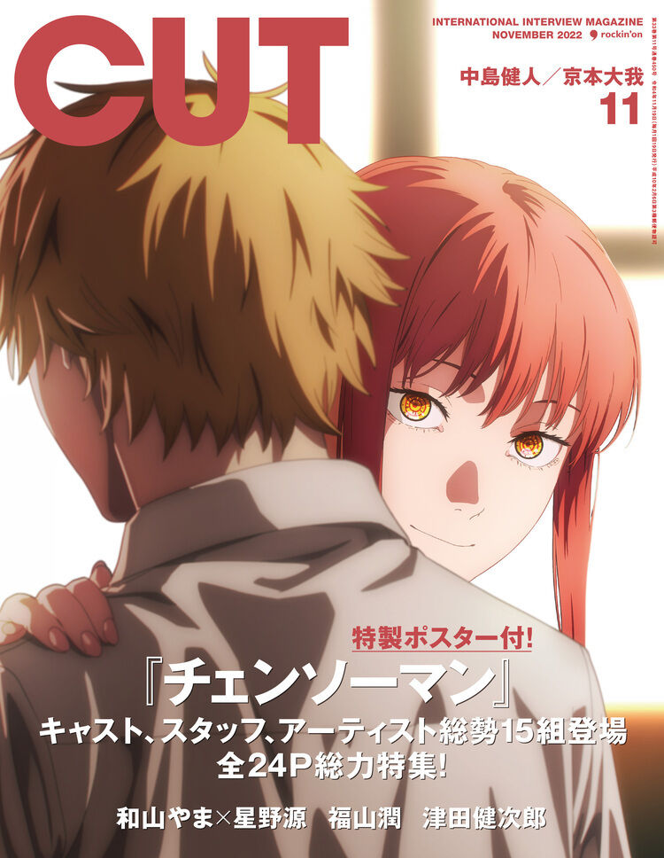 10月19日発売のCUT11月号の表紙巻頭特集が『チェンソーマン』に決定しました!制作決定のニュースが出た時からTVアニメ『チェンソーマン』に対して抱いていた期待は、PVが出るたびに募るばかりでしたが……昨日ついに解禁された本PV、米津玄師によるOP楽曲、そして挿入歌のマキシマム ザ ホルモン+11組のアーティストが参加する「全12話週替わりED」という未だかつてない取り組みの知らせに(しかも2022年最強と言えるアーティストたち!)、この秋は『チェンソーマン』が掻っ攫うことを確信した方、多いんじゃないでしょうか?もちろん我々CUT編集部もそのひとりです。ので!次号、CUT11月号では、『チェンソーマン』表紙巻頭大特集を展開いたします!表紙はMAPPA描き下ろしのスペシャルイラスト。まだ内容は言えないですが、ファンのみなさんの胸が熱くなること必至のものになりそうです。同イラストで特大ポスター付録も制作します!そして中面には、キャスト・スタッフ・アーティスト、総勢16組が集結! それぞれの立場から、『チェンソーマン』に懸ける想いや愛をたっぷり言葉にしてもらいました。CUTの発売は10月19日。『チェンソーマン』をより深く楽しめるような一冊にすべく、鋭意製作中です。ぜひ楽しみにしていてください!(安田季那子)CUT11月号、現在予定しているラインナップは以下の通りです。