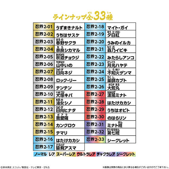 <商品情報>TVアニメ『NARUTO-ナルト- 疾風伝』のオリジナル書き起こしイラストのシールウエハース第2弾が登場!2弾は少年時代の中忍試験編のキャラをメインに収録した、全33種。チャクラレア2種は、ミナト班と第七班をホロ&箔押しの豪華仕様で収録!【単品内容】●シール1枚(全33種/うちシークレット1種)●キャラメルクリーム味ウエハース1枚※セット販売のみ承っております。※1セットで全種揃いません。【素材】N,R,SRのシール:PET【サイズ】H約52mm × W約52mm【対象年齢】6歳以上