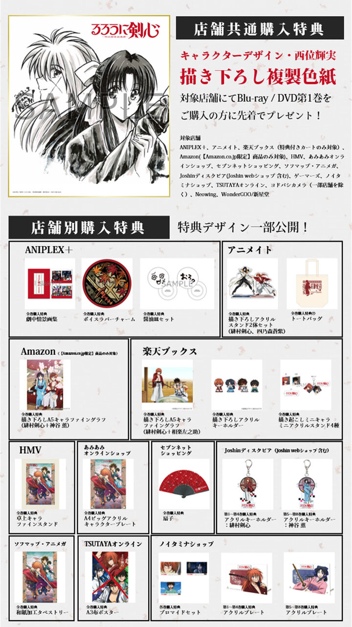 全巻購入特典①描き下ろしA5キャラファイングラフ(緋村剣心+相楽左之助)全巻購入特典②描き下ろしアクリルキーホルダー(キャラファイングラフと同絵柄となります)全巻購入特典③描き起こミニキャラミニアクリルスタンド4種(緋村剣心・神谷 薫・明神弥彦・相楽左之助)全巻購入特典④ポーチ(ミニアクリルスタンドと同絵柄となります)全巻購入特典④オリジナル湯呑(ミニアクリルスタンドと同絵柄となります) -