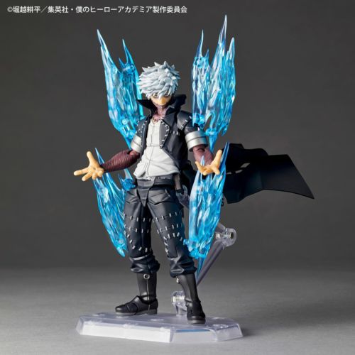 ●頭部は黒髪と、正体を明かした後の白髪の2パターンを交換可能。表情パーツもそれぞれに異なり、黒髪用にはシニカルな通常顔が正面目線と左目線の2タイプに、強烈な笑みを浮かべた睨み顔の3種。白髪用には正面目線と右目線の通常顔に、見下すような冷笑顔、歪んだ想いを露わにした狂気顔の4種が付属します。●交換用手首も、ひとつひとつがキャラクター性を意識した造形。自らの過去を語る際のポーズや“ダビダンス”をイメージしたものなど独特の仕草に、ポケットに手を入れたポーズ用のものも用意しました。●“個性”「蒼炎」のエフェクトは、大ボリュームの6個が付属。勢いよく迸る形状の4個はそれぞれ手足に取り付けられる他、2つを組み合わせることで円筒状にして噴射する様子にも。メラメラと燃え上がる形状のエフェクト2個も付属します。さらに、燃焼の擬音「FOOSH」のオノマトペシートで、迫力を加えることができます。