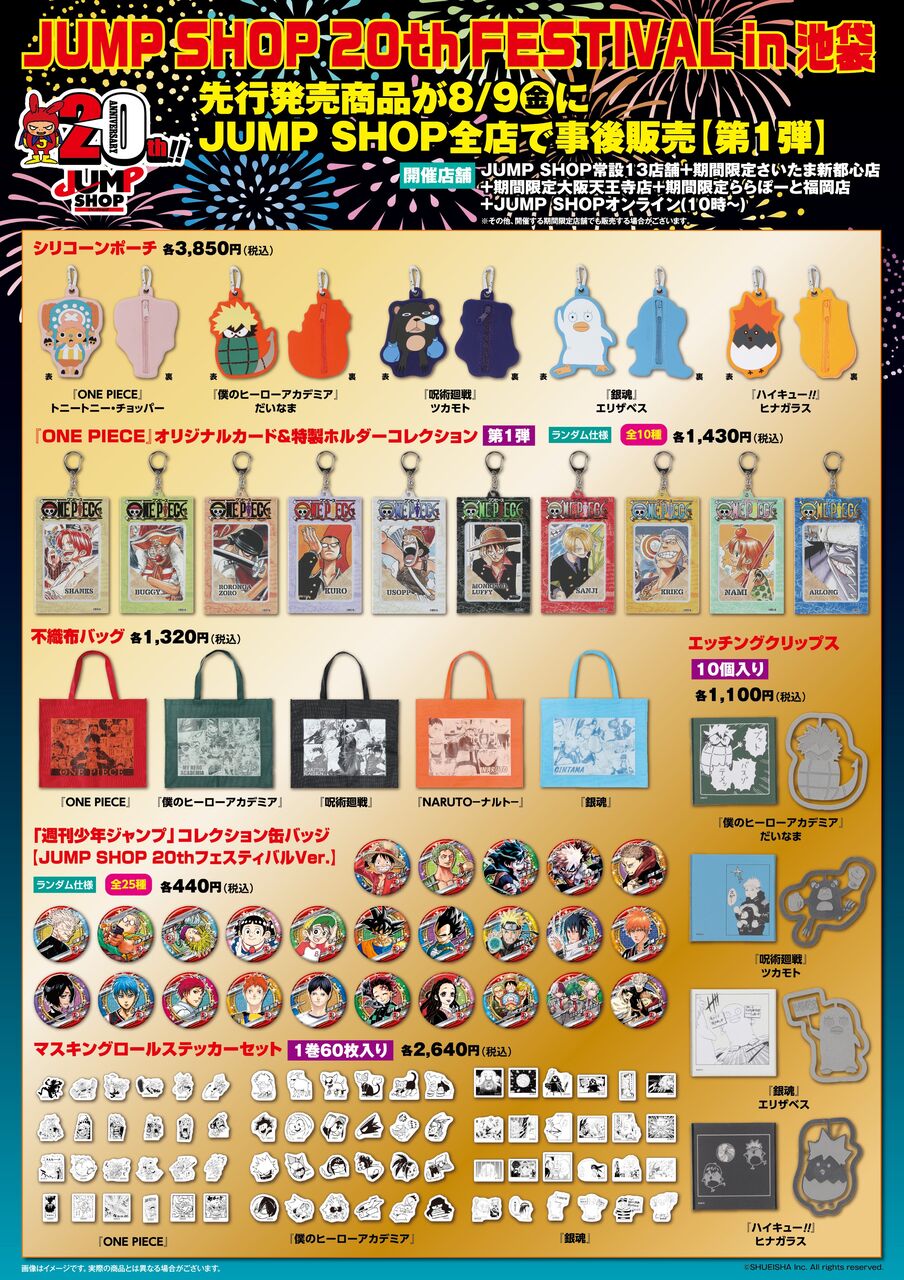 8/9(金)、9/5(木)、9/9(月)JUMP SHOP 20th FESTIVAL in池袋先行販売商品の事後販売!常設13店舗+さいたま新都心店+大阪天王寺店+ららぽーと福岡店+JUMP SHOPオンライン(10時~)で発売