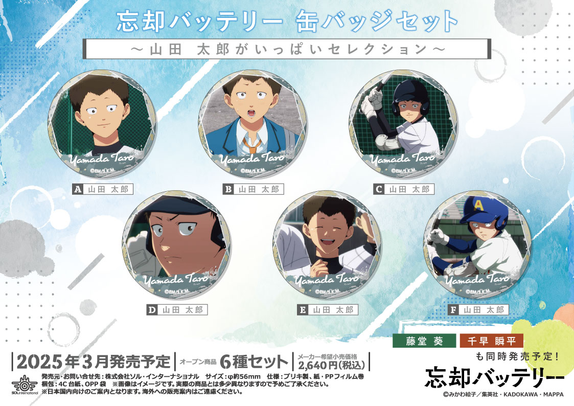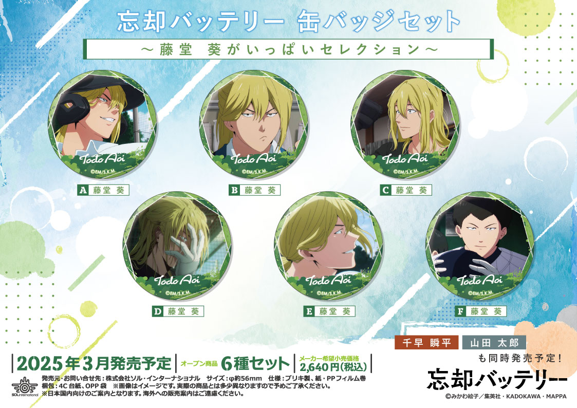 ■商品名:忘却バッテリー 缶バッジセット~藤堂 葵がいっぱいセレクション~■価格:2,640円(税込)■発売月:2025年3月予定■種類:全1種(6個入り) オープン商品■仕様:ブリキ製、紙・PPフィルム巻■サイズ:φ約56mm■梱包:4C台紙、OPP袋