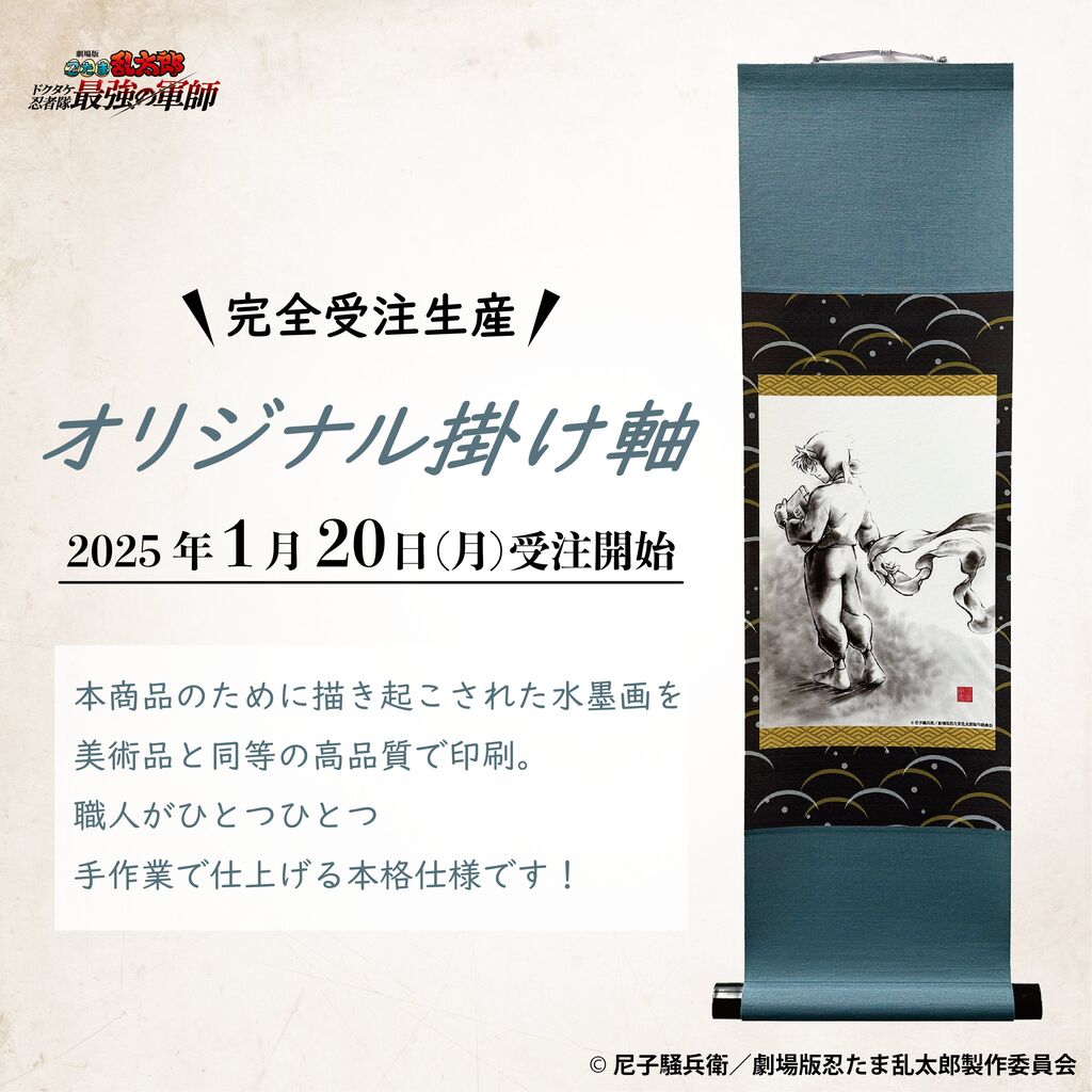 映画の公開決定発表時に公開された“超ティザービジュアル”の水墨画掛け軸です。水墨画で描かれた“超ティザービジュアル”は、本商品のために特別に描き起こされたものです。掛け軸は品質にこだわり、国家検定一級表装技能士を含む職人の手によって一つ一つ手作業で製作。イラストは、美術品や仏画の複製画製作と同等の品質で印刷されます。