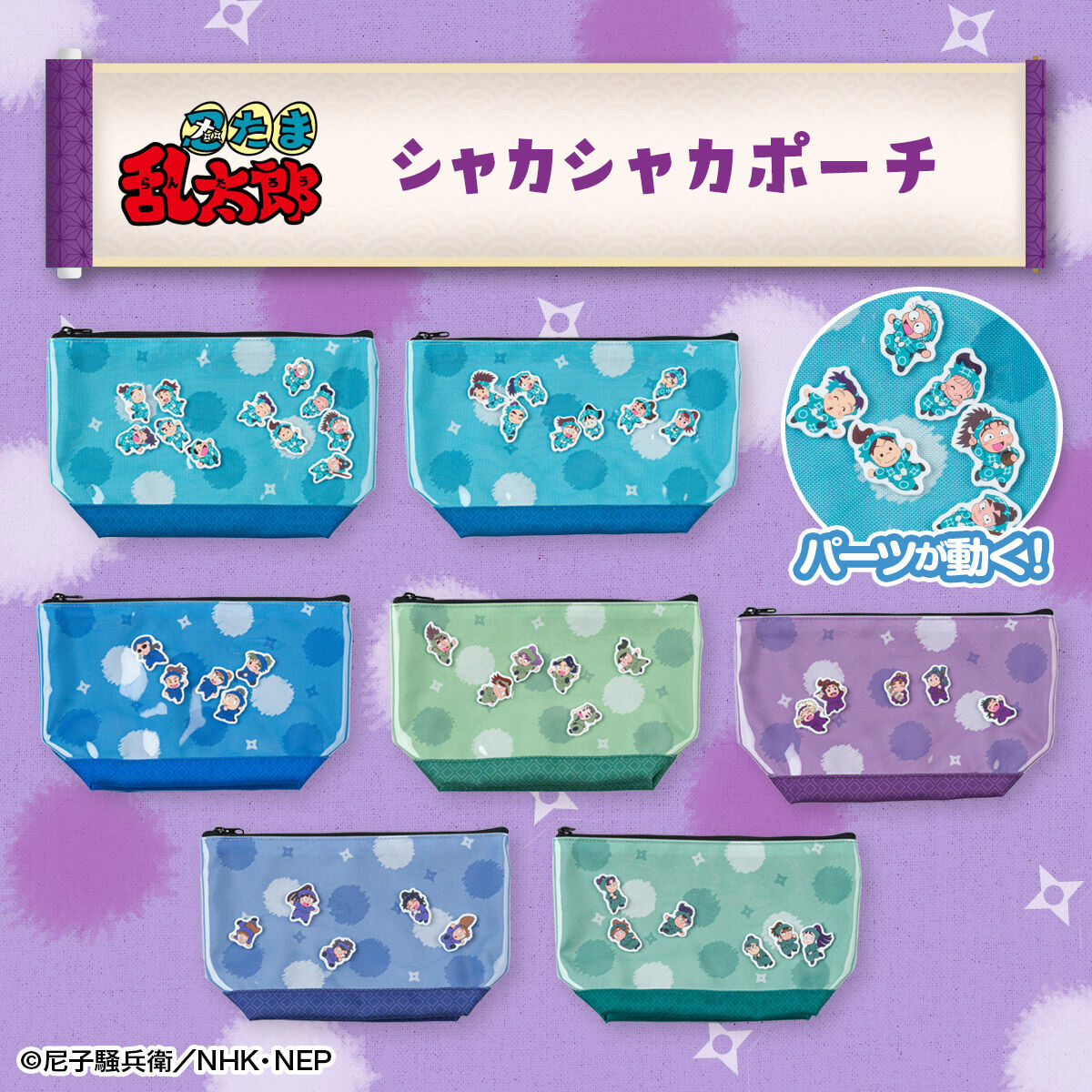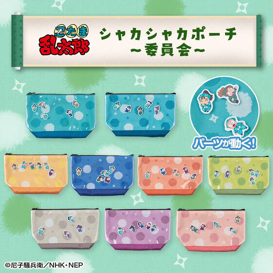 『忍たま乱太郎』のシャカシャカポーチが登場!デフォルメイラストのパーツがしゃかしゃか動いて可愛いポーチです。委員会別のデザインとなっており、別種のシャカシャカポーチとはポーズと表情が異なるデフォルメイラストを使用しています。片面のクリア素材の内側にキャラクターのプレートが入っています。会計委員会、作法委員会、図書委員会、保健委員会、体育委員会、用具委員会、生物委員会、火薬委員会、学級委員長委員会の全9種。