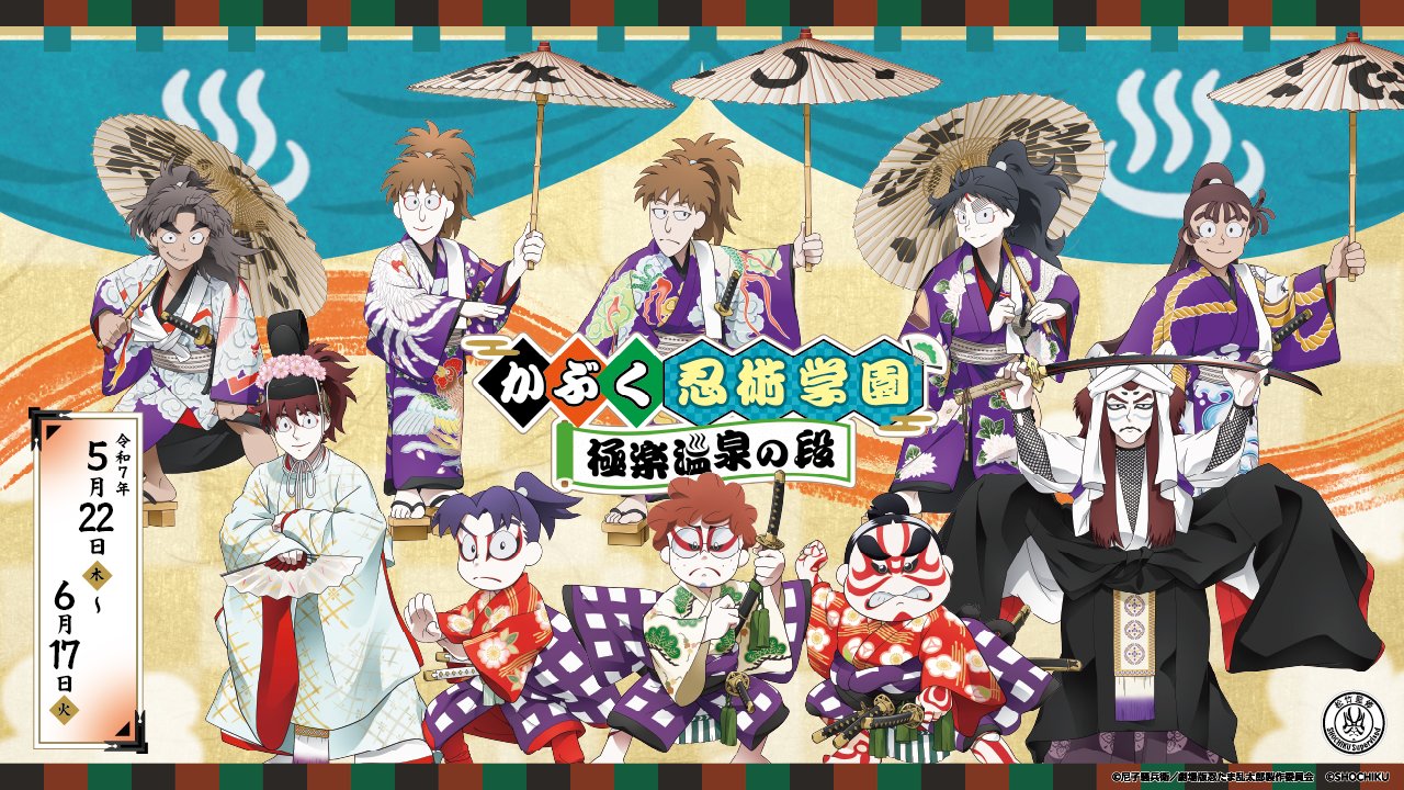 歌舞伎に扮したキャラクターたちの描きおろしイラストが登場!グッズやメニュー販売の他、コラボ風呂など実施