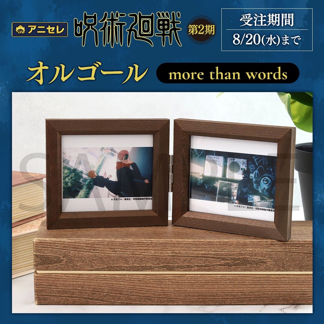 TVアニメ「呪術廻戦」第2期のエンディングテーマ「more than words」が木製見開きフォトスタンドタイプのオルゴールになって登場!印象的なシーンを厳選したイラストカード30枚をセットにした、豪華な仕様です。オルゴールの音色と共に、思い出のシーンを振り替えることが出来ます。フォトスタンドには、お手持ちの写真を入れることも可能です。【サイズ】オープンサイズ:約19.3×8.5cm収納可能写真サイズ:約横7.8×縦6.8cm以内付属品:イラストカード30枚【仕様】フォトフレーム型オルゴール:木・金属イラストカード:紙 フルカラー印刷