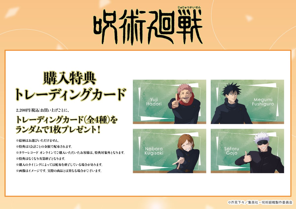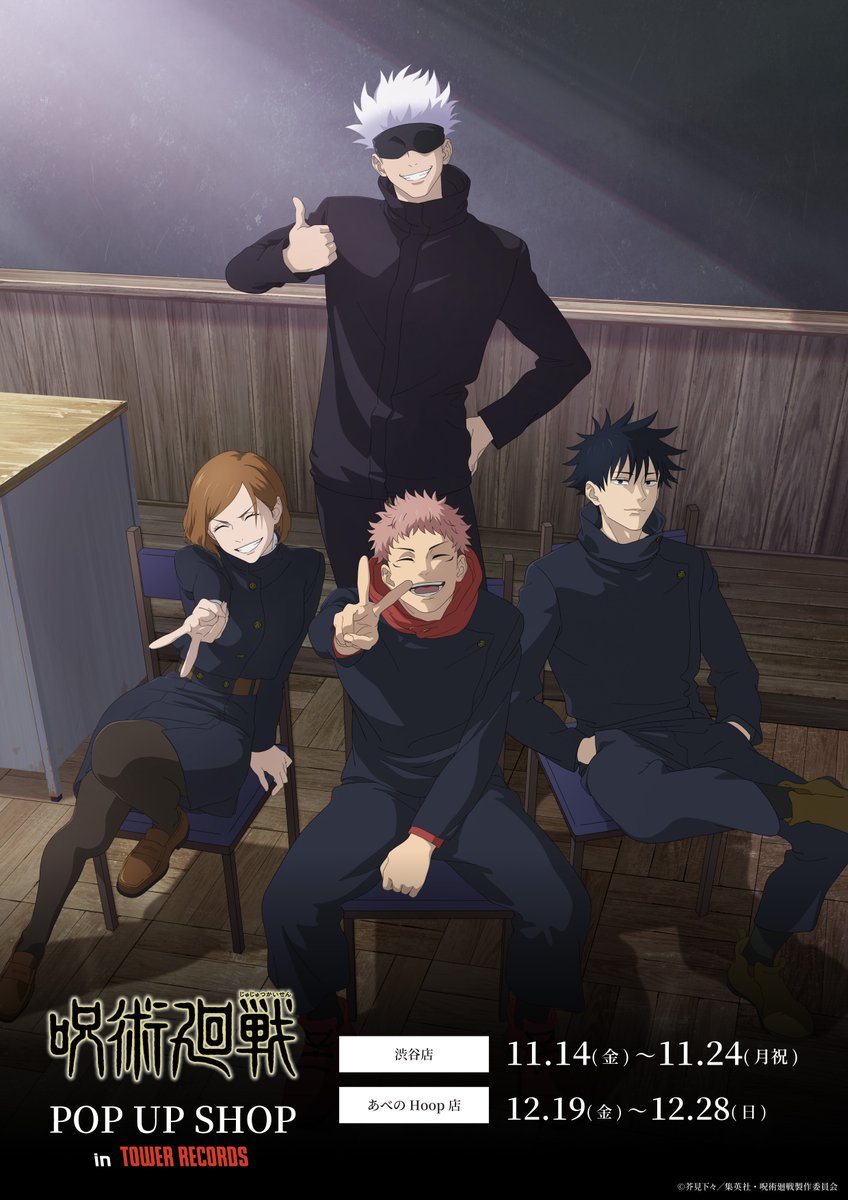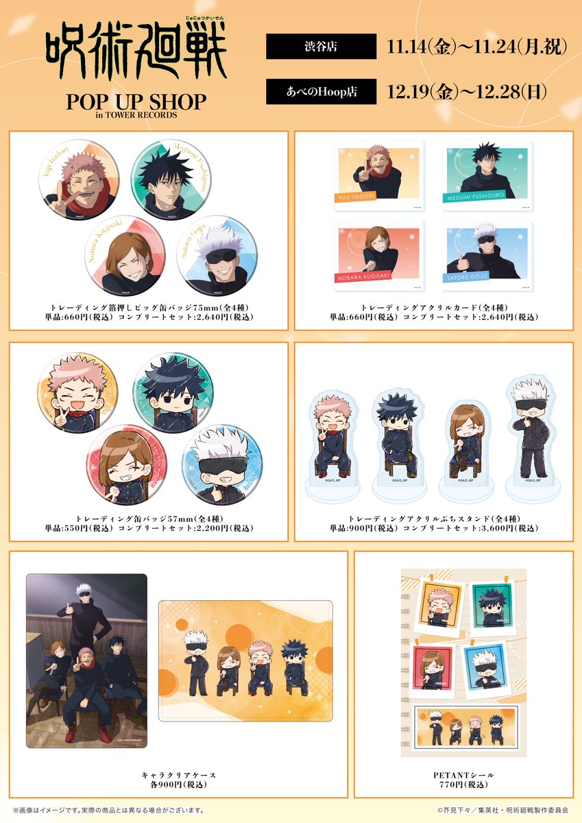『呪術廻戦』POP UP SHOP in TOWER RECORDS タワーレコード 2025/11/14 受注期限:2025年11月14日(金)12:00~12月28日(日)23:59商品発送:2026年2月下旬以降予定<予約&購入> タワーレコード オンライン POP UP SHOP(概要) <商品紹介><イベント概要>『呪術廻戦』POP UP SHOP in TOWER RECORDS開催決定!"クラス写真"テーマの描き下ろしイラストを使用した新商品が登場!■タワーレコードあべのHoop店開催期間:11月14日(金)~11月24日(月・祝)■タワーレコード新宿店開催期間:12月19日(金)~12月28日(日) <関連商品> < 前の記事次の記事 > コメント コメントフォーム 名前 コメント 記事の評価 リセット リセット 顔 星 情報を記憶 コメントを投稿する