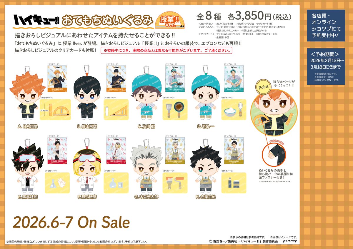 ハイキュー!! おてもちぬいぐるみ-授業!!ver.- 2026/02/13 発売日:2026年6月 発売元:ショウワノート(POMMOP)参考価格:3,850円(税込) <予約&購入> アニメイト TOHO animation STORE あみあみ ネオウィング METAL BOX アニメストアホビーストック セブンネット 楽天市場駿河屋 AmazonYahoo!ショップコレイズ <商品情報><セット内容>・ぬいぐるみ各1体・持ち手パーツ2個・クリアカード1枚ぬいぐるみサイズ:約130×H180×D80mm(カラビナ含まず・柄により異なる)クリアカードサイズ:W55×H75mm素材:ぬいぐるみ:綿、ポリエステルクリアカード:PET<関連商品> < 前の記事次の記事 > コメント コメントフォーム 名前 コメント 記事の評価 リセット リセット 顔 星 情報を記憶 コメントを投稿する