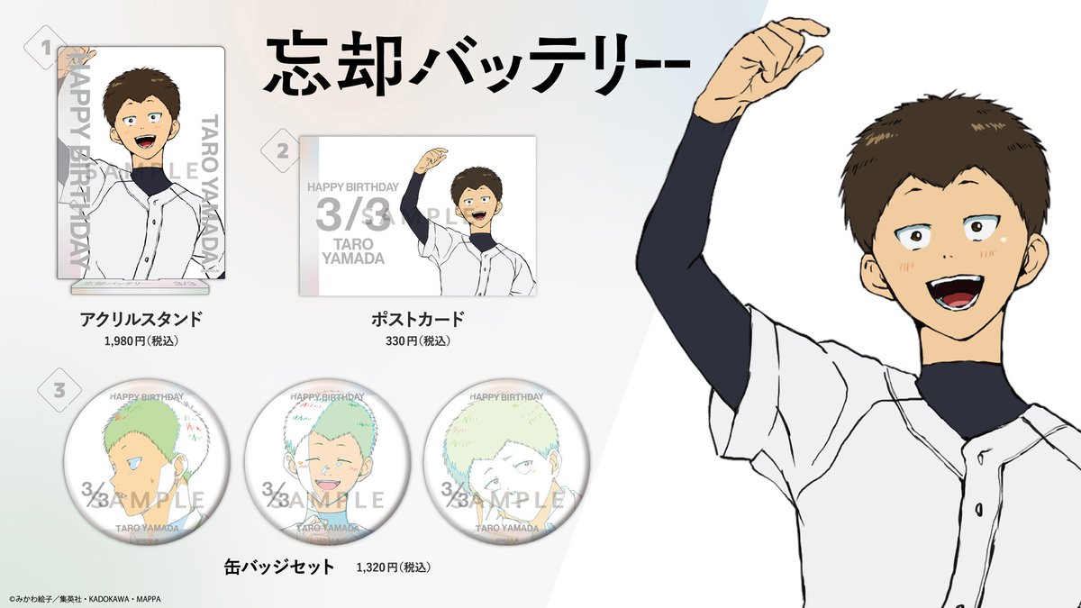 TVアニメ『忘却バッテリー』山田太郎 バースデー 2026Ver. 2026/03/03 発売日:2026年5月 発売元:MAPPA参考価格:<予約&購入> MAPPA online shop アニメイト <商品情報>缶バッジセットアクリルスタンドポストカード<関連商品> < 前の記事次の記事 > コメント コメントフォーム 名前 コメント 記事の評価 リセット リセット 顔 星 情報を記憶 コメントを投稿する