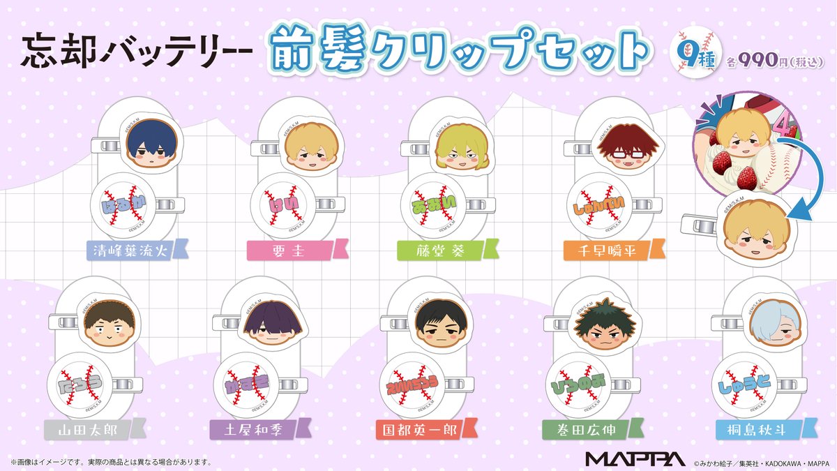 忘却バッテリー 前髪クリップセット 2026/03/03 発売日:2026年6月中旬 発売元:MAPPA参考価格:990円(税込)<予約&購入> アニメイト MAPPA online shop <商品情報>【商品サイズ】約3.5×3.5cm【商品素材】本体・レバー:アクリルばね:ステンレスクッキーをモチーフにしたデフォルメイラストと名前をデザインした前髪クリップセットです。<関連商品> < 前の記事次の記事 > コメント コメントフォーム 名前 コメント 記事の評価 リセット リセット 顔 星 情報を記憶 コメントを投稿する